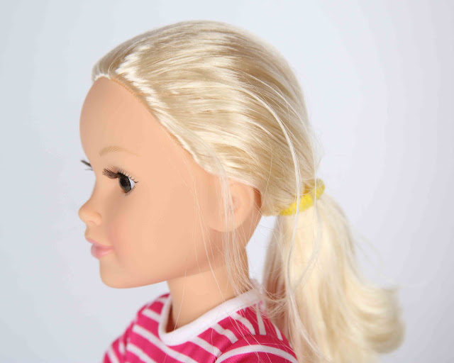 Now onto the most frustrating part of this set; the helmet. I was super excited that the Journey Girls set has a helmet. It's a great way to promote safety through play. If my doll wears her helmet, I may be more likely to when I ride my bike. and the helmet is really cute with the front being plain white with the "JG" symbol on it, and then the helmet fades to the purple that is on the basket lip. It's a cool design. Sadly the helmet does not fit. Well, that isn't completely true. The helmet fits perfectly on Calista's head, but getting the strap buckled is a lesson in patience.
